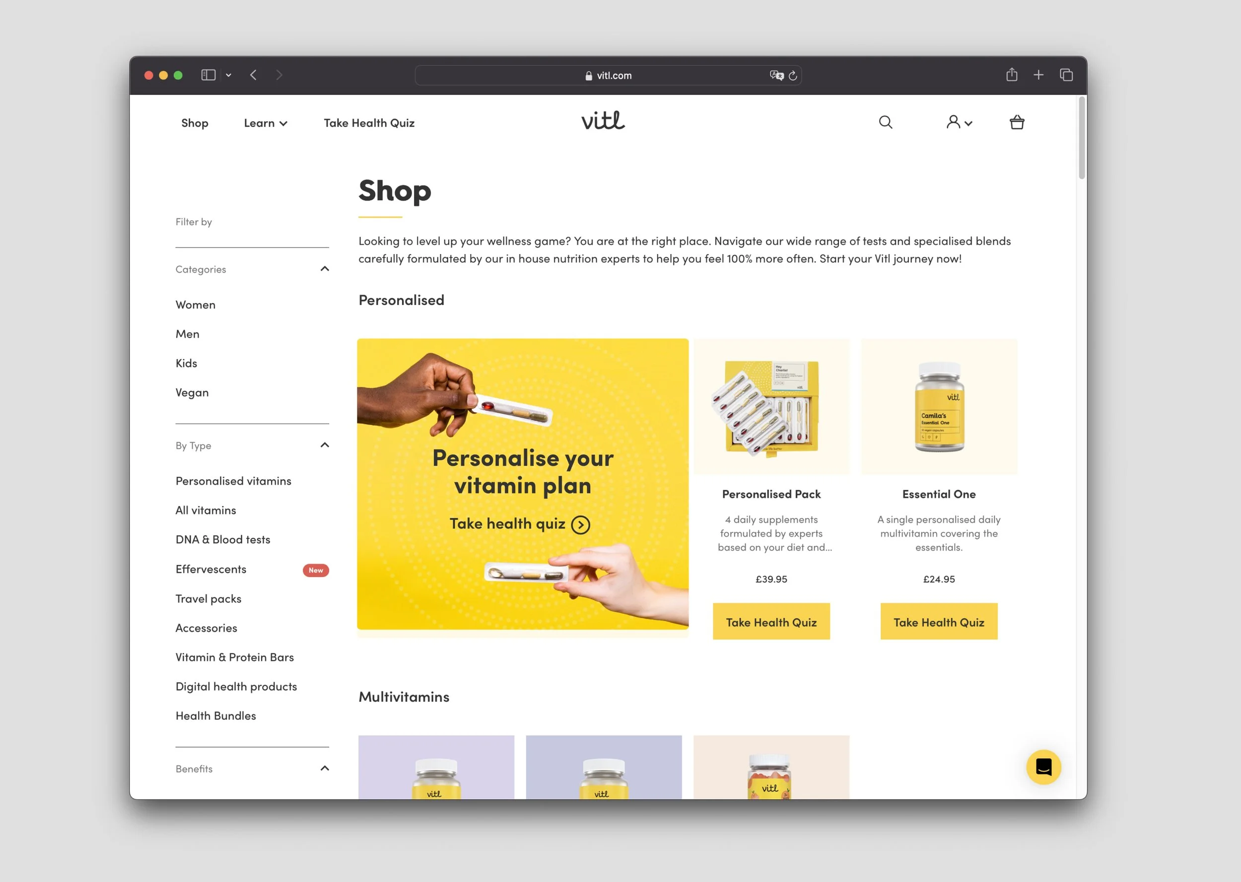 Vitl is a personalised vitamin and nutrition company offering tailor-made supplements and personalised health advice. An online shop was needed to support the growing number of product launches whilst allowing users navigate the right vitamin choice for their needs.